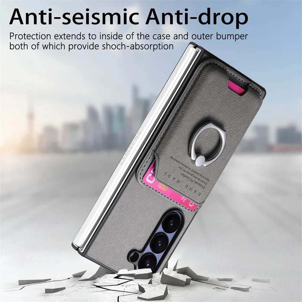 Protect your Z Fold in style with this detachable leather wallet case. Crafted for functionality and elegance, it features a powerful magnetic lock, built-in card holder, and a ring bracket that doubles as a stand. The detachable design allows you to use the wallet separately or snap it back on when needed — thanks to its 2500gs magnetic strength, it's stronger than most MagSafe wallets.