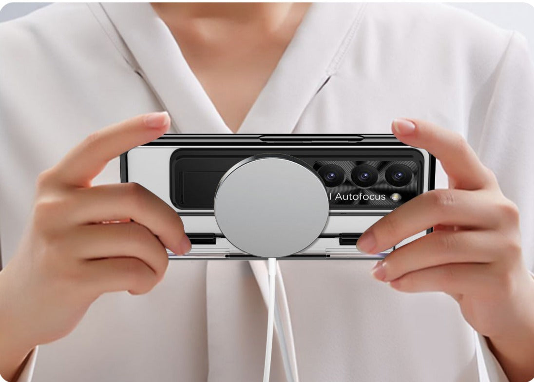 Ensure your Galaxy is fully protected from all angles. The Hinge Z Fold 6, 5, 4 Wireless Transparent Kickstand Case, guards against drops, impacts, and everyday wear and tear.