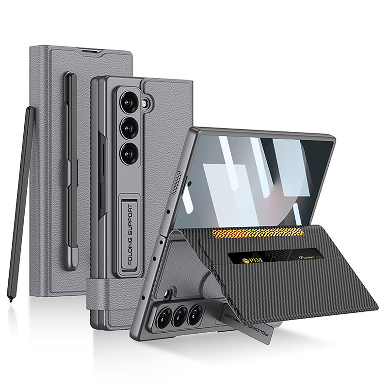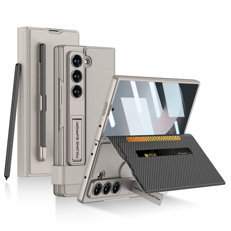 Elevate your Z Fold 7, 6, 5 experience with the EleganceVault Leather Case, a harmonious blend of luxury, practicality, and protection. This premium case features an exquisite leather card wallet for carrying your essentials and a secure pen slot, ensuring you’re always prepared for productivity .The tempered glass screen protector shields your device from scratches , while the shockproof construction provides robust defense . With its sophisticated design and superior functionality, the EleganceVault Leather Case is the perfect companion for your Z Fold.