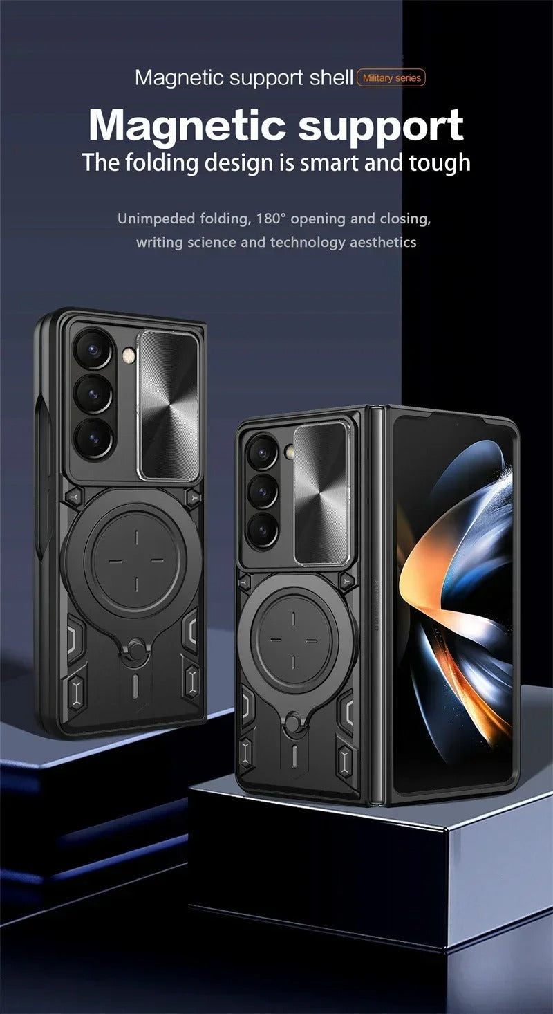 Meet FlexiArmor Ring, the magnetic shockproof case designed to keep up with your fast-paced life—crafted for the Samsung Galaxy Z Fold 7, 6, and 5. Built with rugged armor protection and a 360° rotatable magnetic ring, this case seamlessly transforms into a car mount holder, a hands-free stand, or a secure grip for any task. The sliding camera cover protects your lenses on the go, while MagSafe compatibility ensures quick wireless charging and magnetic accessory use. Whether you're commuting or relaxing, FlexiArmor has you covered—literally.More grip. More angles. More protection—with FlexiArmor, your Fold stays safe, sleek, and road-ready.