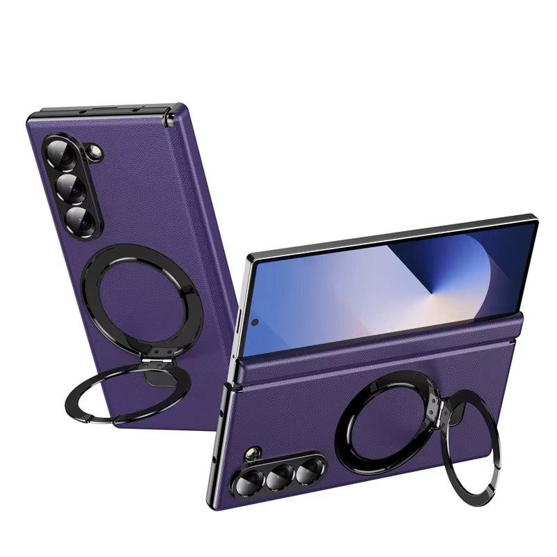 Elevate your Galaxy Z Fold experience with MagLeather Fold, where classic leather styling meets modern magnetic tech. Crafted with precision, this case features a sleek leather shell, full hinge armor, and a tempered glass front protector—combining elegance and endurance. The powerful built-in MagSafe ring ensures magnetic wireless charging and effortless accessory compatibility, while the magnetic kickstand bracket makes hands-free viewing smoother than ever.